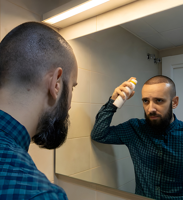 Hair loss is significantly visible at the crown area of the scalp. Helps in camouflaging the bald spots.